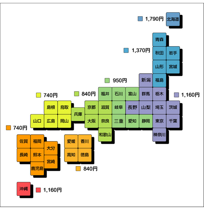 東海・北陸地方近辺:950円 関東・甲信越地方近辺:1,160円 東北地方近辺:1,370円 北海道:1,790円